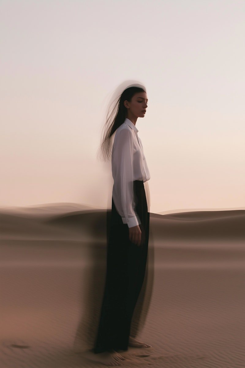 Set in a vast desert landscape, this campaign explores light, shadow, and movement, using double-exposure techniques to create a timeless, high-fashion visual experience.